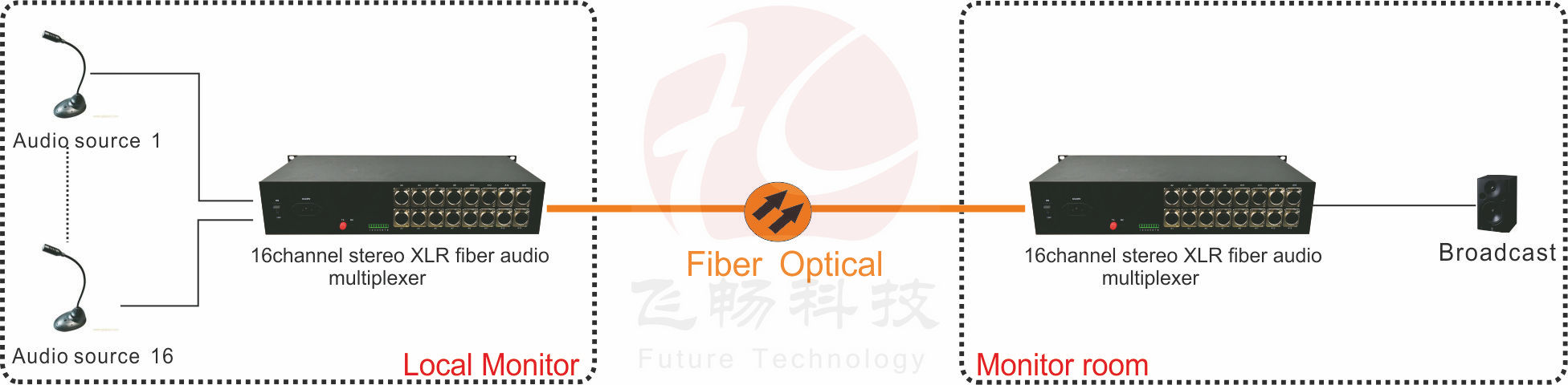 1-16 integrated multiplexing audio optical transmitter / receiver using digital coding technology, audio interface XLR (XLR), can be audio signals, data signals, switch signals and Ethernet signals through a single-mode fiber achieve long-distance two-way transmission, the maximum signal can be transmitted without distortion-free relay 100Km. Audio interface with 24Bit AD / DA, 128K sampling, studio-level transmission quality.The fiber audio multiplexer is composed of optical transmitter and optical receiver, can be Set to 8 channel bi-directional audio and 16 channel unidirection audio.