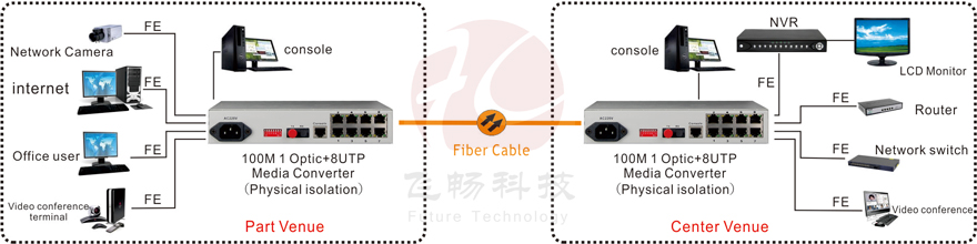 This device can provide 8Channel mutual independence full isolation line rate 100M Ethernet circuit at one optical direction (single-mode fiber or double-mode fiber) .It is applied at construction intranet, public information network, and need two network height isolation occasions. It is also applied at this occasion that cable resources is very tense and need many independent Ethernet circuit. Besides, it can be used for expanding DSLAM bandwidth without changing original optical circuit. This optical fiber transceiver not only saves one device, but also saves 7 pairs of fiber.