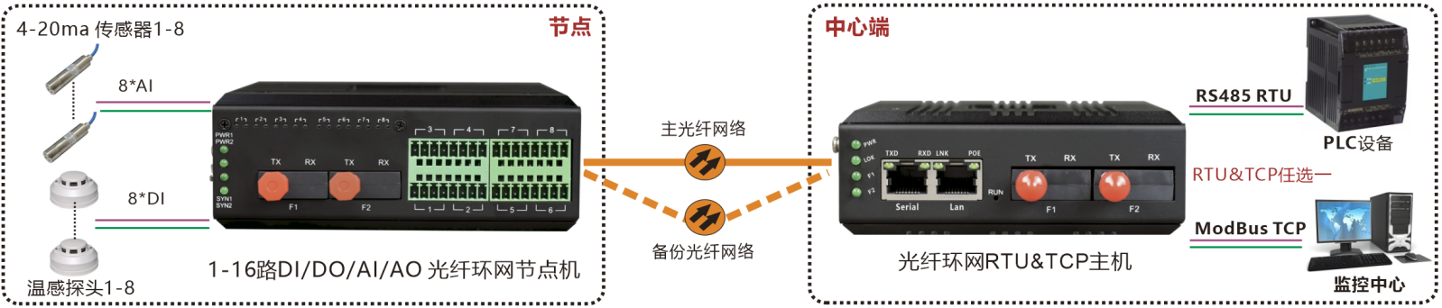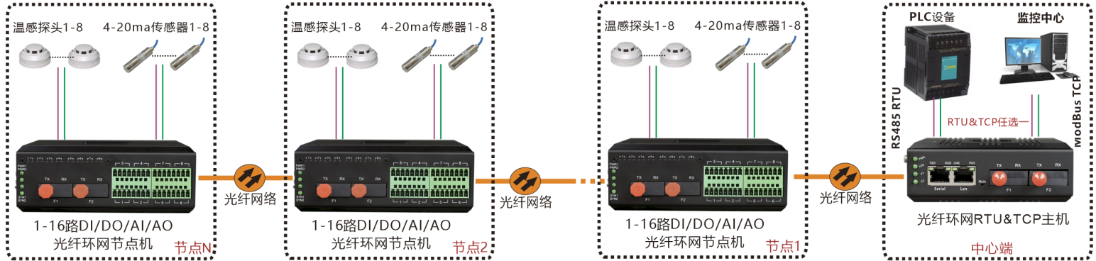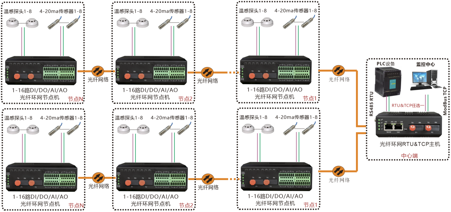 工業(yè)級環(huán)網(wǎng)型光端機(jī)提供每個節(jié)點最多16路DI/DO/AI/AO開關(guān)量模擬量在光纖中傳輸,支持多種光纖網(wǎng)絡(luò)拓?fù)浣Y(jié)構(gòu):點對點通訊、鏈型網(wǎng)絡(luò)、星型網(wǎng)絡(luò)及冗余環(huán)網(wǎng)自愈保護(hù)等拓?fù)浣Y(jié)構(gòu),并可在此基礎(chǔ)上組網(wǎng)為更復(fù)雜的網(wǎng)絡(luò)拓?fù)浣Y(jié)構(gòu),具有環(huán)網(wǎng)自愈保護(hù)功能。主機(jī)采用ModBus RTU與ModBus TCP雙上聯(lián)接口,方便現(xiàn)場實施。