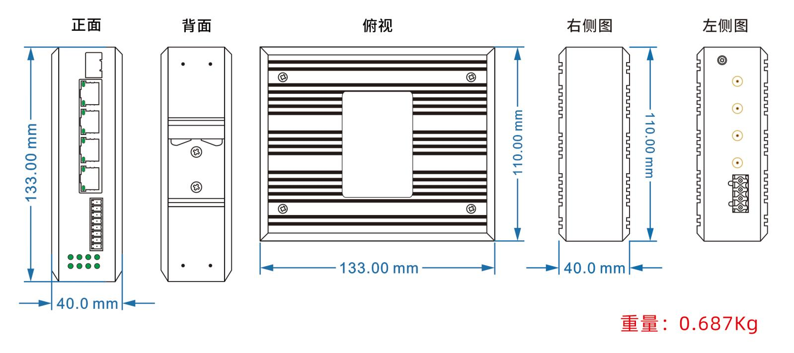外殼:IP40防護等級,鋁合金材質 尺寸:133mm(長) x 120mm(寬) x 41mm(高) 裝方式:導軌安裝、壁掛式安裝 |