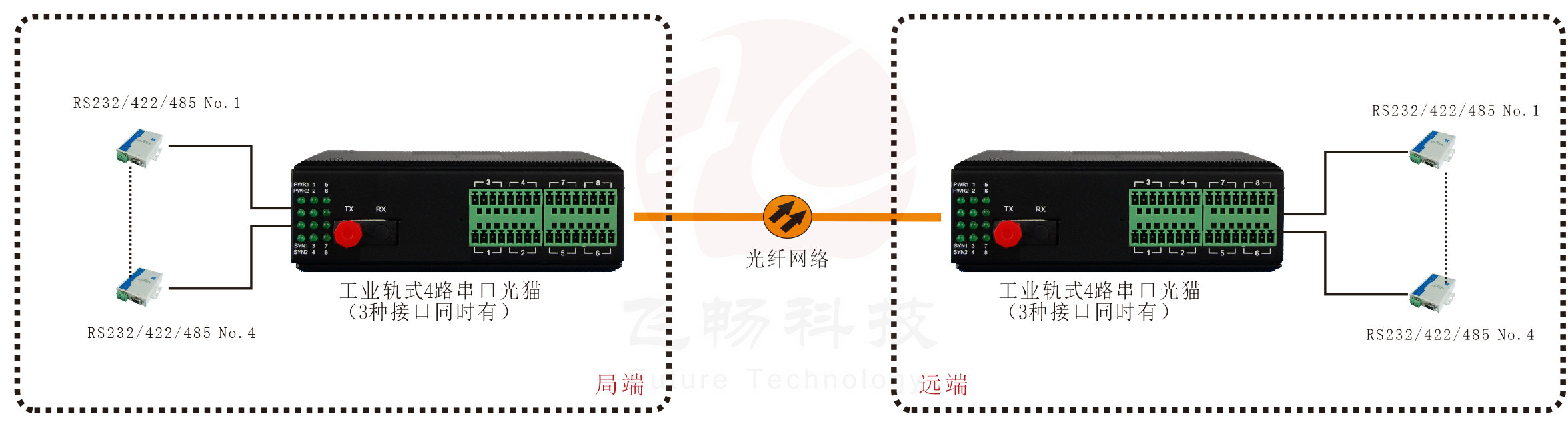 • 飛暢科技-工業(yè)軌式1-4路RS232/422/485(三種接口同時(shí)提供)光貓