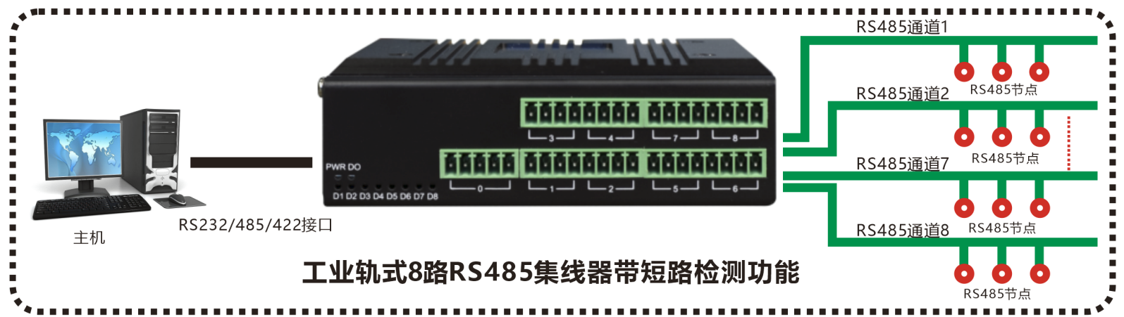 | 產(chǎn)品功能描述 | 工業(yè)軌式 8路RS485集線器(帶短路檢測(cè)并隔離功能) |