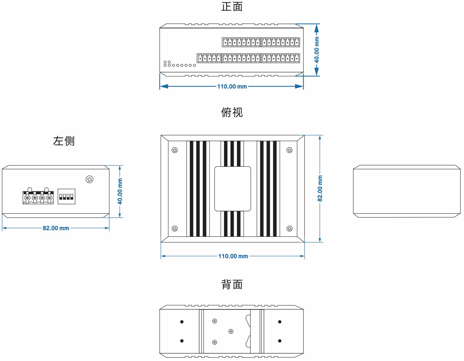 外殼:IP40防護(hù)等級(jí),鋁合金材質(zhì) 尺寸:110mm(長(zhǎng)) x 86mm(寬) x 40.0mm(高) 裝方式:導(dǎo)軌安裝、壁掛式安裝 |