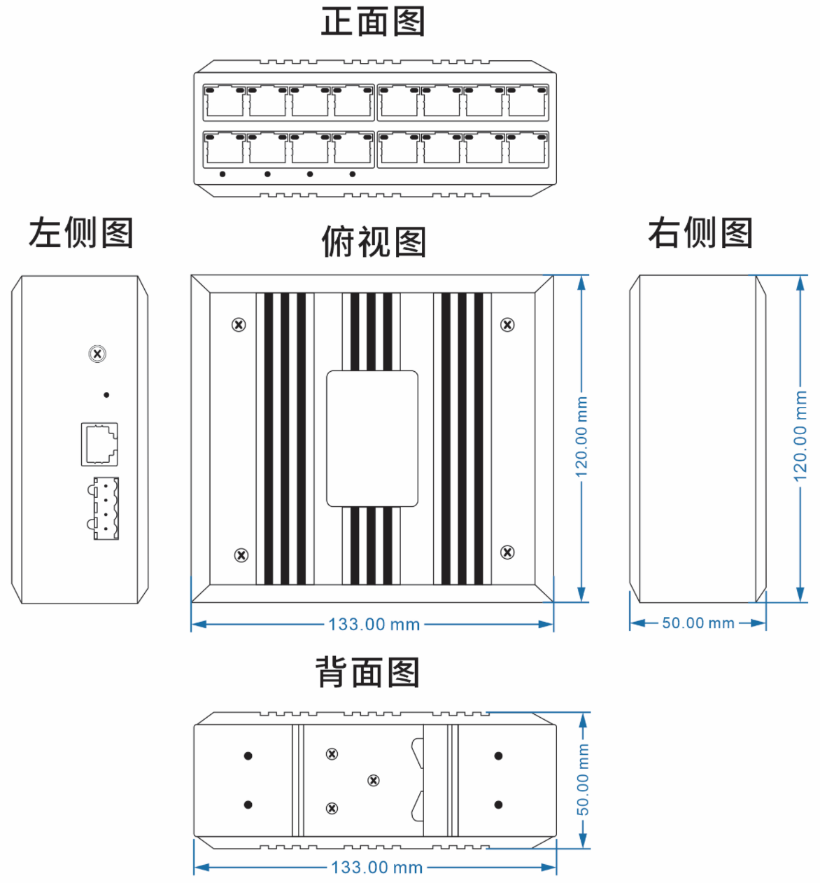 | 電氣和機械特性 | 外觀結構: 133mm(長) x 120mm(寬) x 50.0mm(高) |